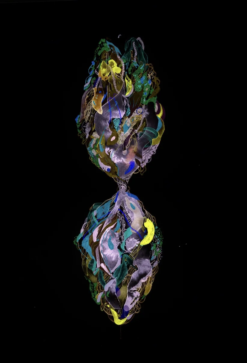 a fluctuation between light and dark emerges, precipitating a looming bifurcation. In employing and suffusing traditional and digital mediums, the forms depicted in this series appear to occupy multiple dimensions at once, whilst at other moments being dissected and reorganized.